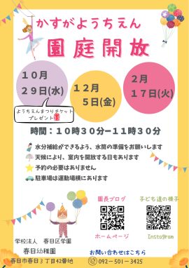 2025.09.29 2学期以降の園庭開放・園内開放のお知らせ 2学期以降の園庭開放・園内開放のお知らせをします。下記のポスターにてご確認ください。幼稚園祭りのチケットもお配りしますのでふるってご参加いただきますようお願いいたします。 Tweet Share Hatena Pocket RSS feedly Pin it ◎令和8年度入園・入会説明会の実施について◎前の記事 第72回大運動会について次の記事