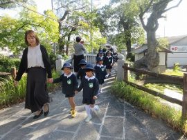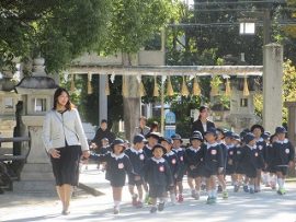 年中組の園児たちが年少組の園児たちを春日神社までエスコートしてくれました。