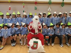 本日(12/10)、一足早くクリスマス会を実施しました。楽しみにしていたクリスマス会、わくわく・どきどきの子どもたちの前にサンタさんがやって来たので、大歓声でした。サンタさんへの質問コーナーでは、子どもらしい質問や核心を突いた質問が出て、盛り上がっていました。先生方の「おおきなかぶ」の音楽劇を鑑賞したのち、サンタさんからのプレゼントもいただいたので、子どもたちは大満足でした。