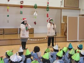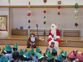 本日(12/10)、一足早くクリスマス会を実施しました。楽しみにしていたクリスマス会、わくわく・どきどきの子どもたちの前にサンタさんがやって来たので、大歓声でした。サンタさんへの質問コーナーでは、子どもらしい質問や核心を突いた質問が出て、盛り上がっていました。先生方の「おおきなかぶ」の音楽劇を鑑賞したのち、サンタさんからのプレゼントもいただいたので、子どもたちは大満足でした。